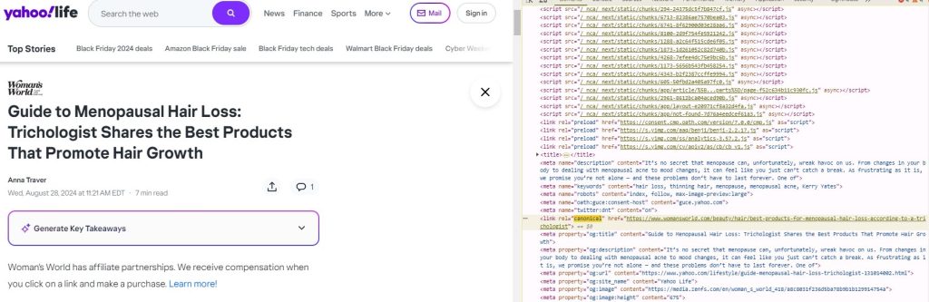 This brings us to the next curious point: Google’s handling of canonical URLs. In the example below, Google seemed to have gotten the canonical URL right at first, linking the article back to the original source. However, after some time, Google appears to have swapped the canonical URL to Yahoo’s article, despite the original having the correct canonical tag.
